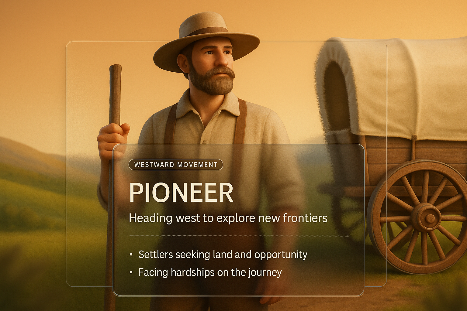 /Collection: /by davooda/Type: PNG/A 3D illustration featuring a pioneer standing next to a covered wagon, with integrated text blocks showcasing the westward movement theme. The design incorporates a smooth gradient background and a transparent label.