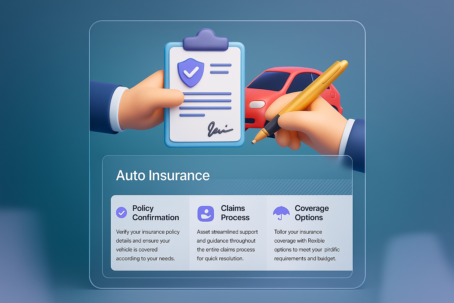 /Collection: /by davooda/Type: PNG/A dynamic 3D illustration showcasing an auto insurance policy being signed. Features include a clipboard, pen, and a car in the background, with layered visual elements and a smooth gradient backdrop.