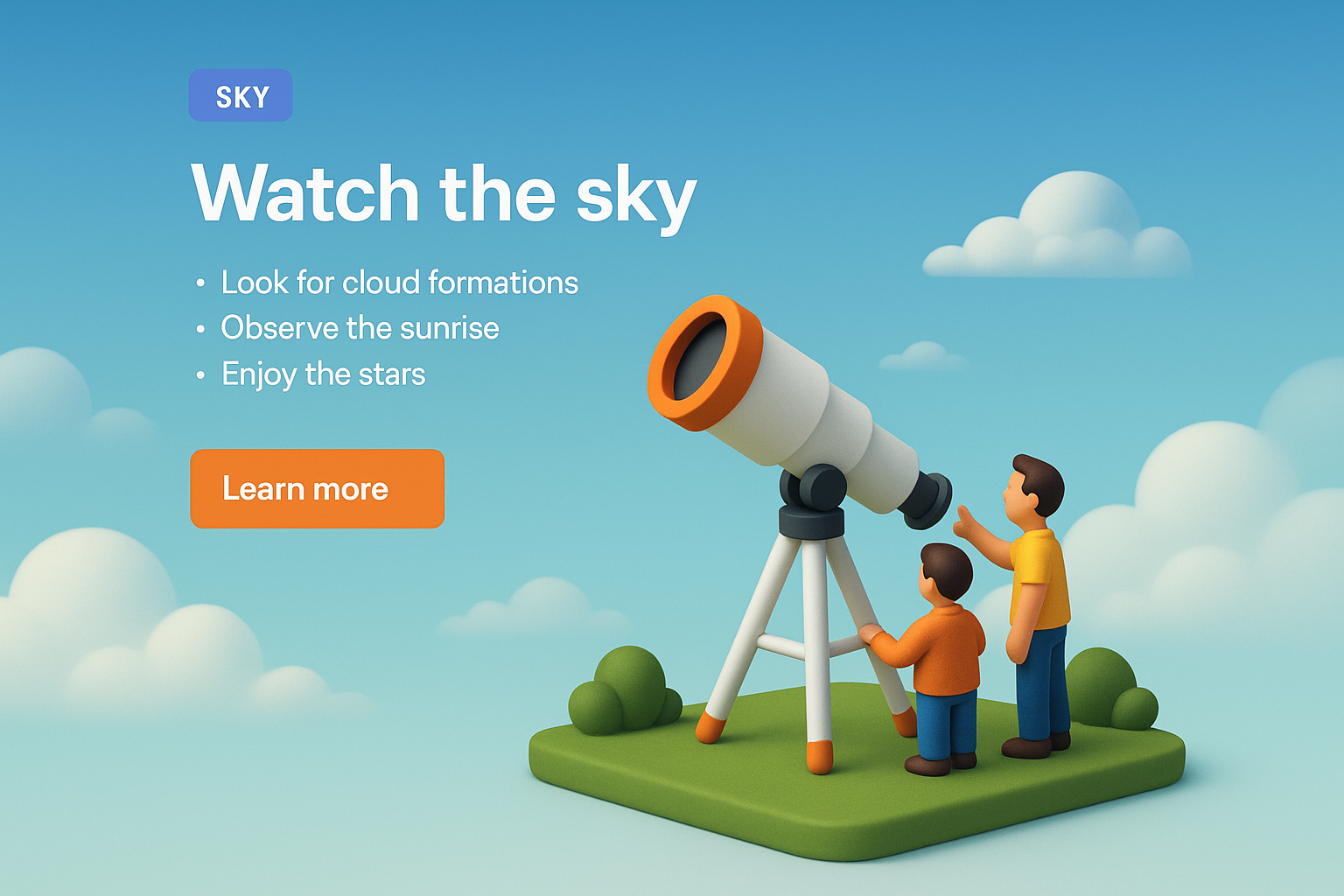 A vibrant 3D illustration depicting a serene sky scene featuring two small characters observing the sky through a telescope, surrounded by fluffy clouds and a grassy base.