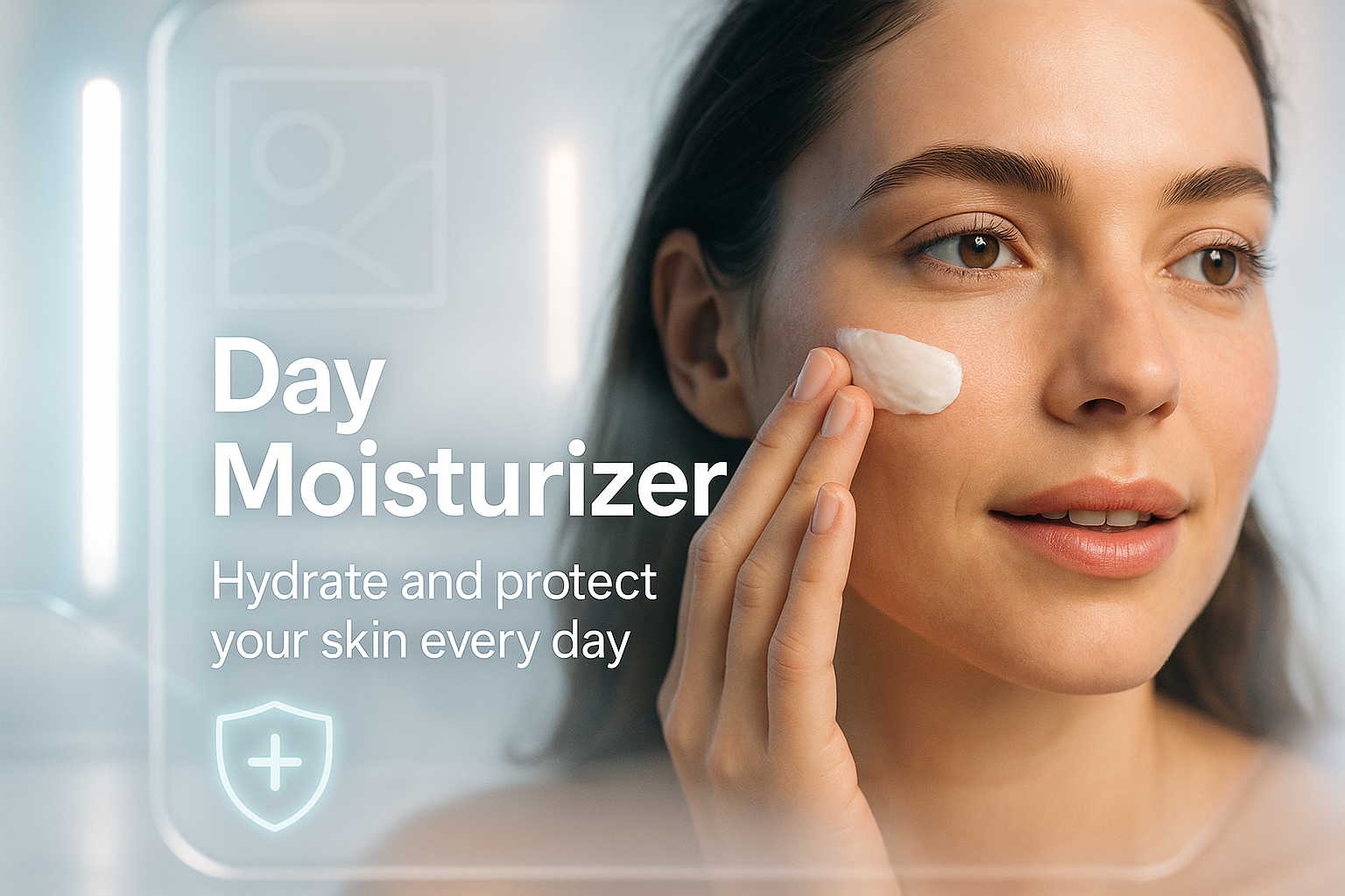 /Collection: /by davooda/Type: PNG/Engaging skincare advertisement showcasing a woman applying moisturizer, emphasizing hydration and protection. The modern design is ideal for social media or e-commerce use.
