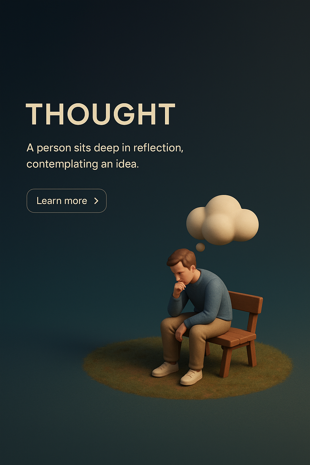 /Collection: /by davooda/Type: PNG/A detailed 3D scene showing a person deep in thought, seated on a bench with a thought bubble above. The background features a smooth gradient, enhancing the contemplative mood.