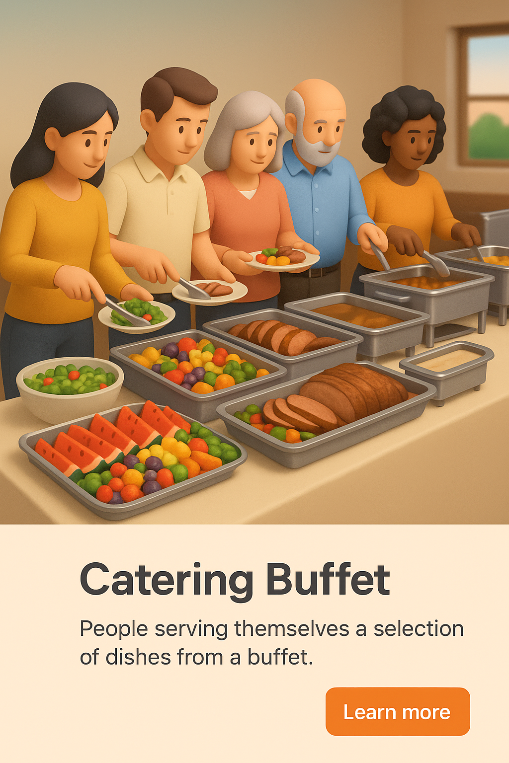 /Collection: /by davooda/Type: PNG/A realistic illustration of a diverse group of people enjoying a buffet in a restaurant. They serve themselves from a variety of colorful dishes featuring meats, fruits, and vegetables.