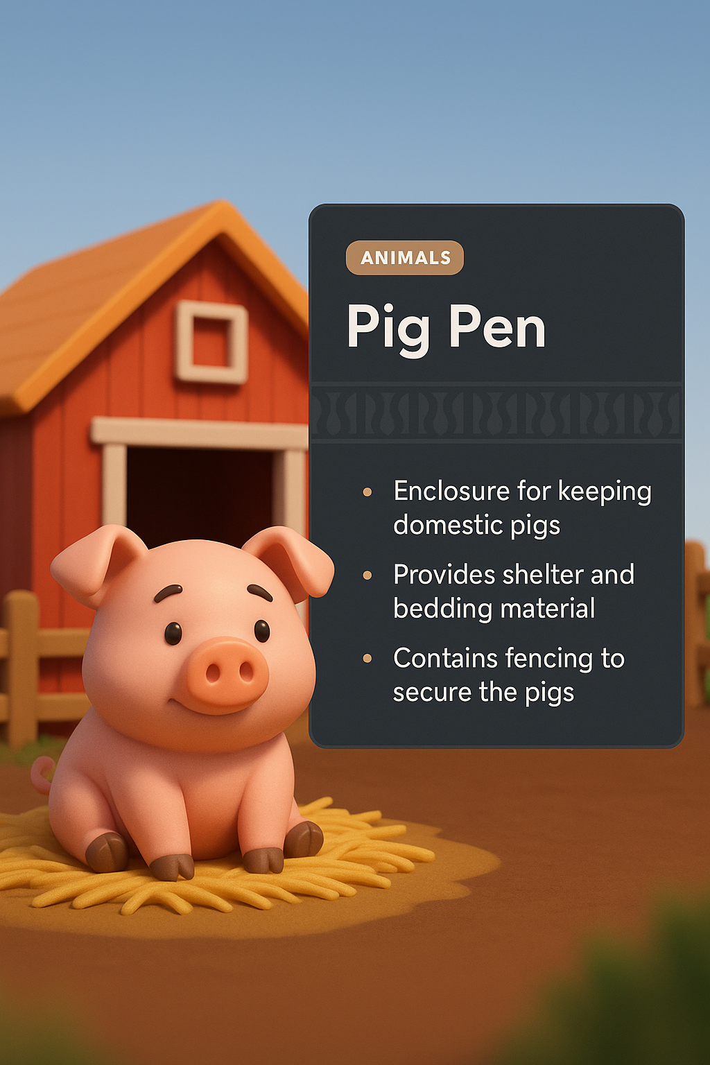 /Collection: /by davooda/Type: PNG/A vibrant 3D illustration of a pig pen featuring a cute pig and a barn in the background. The design includes a dark overlay with informative text about the pig pen's purpose.
