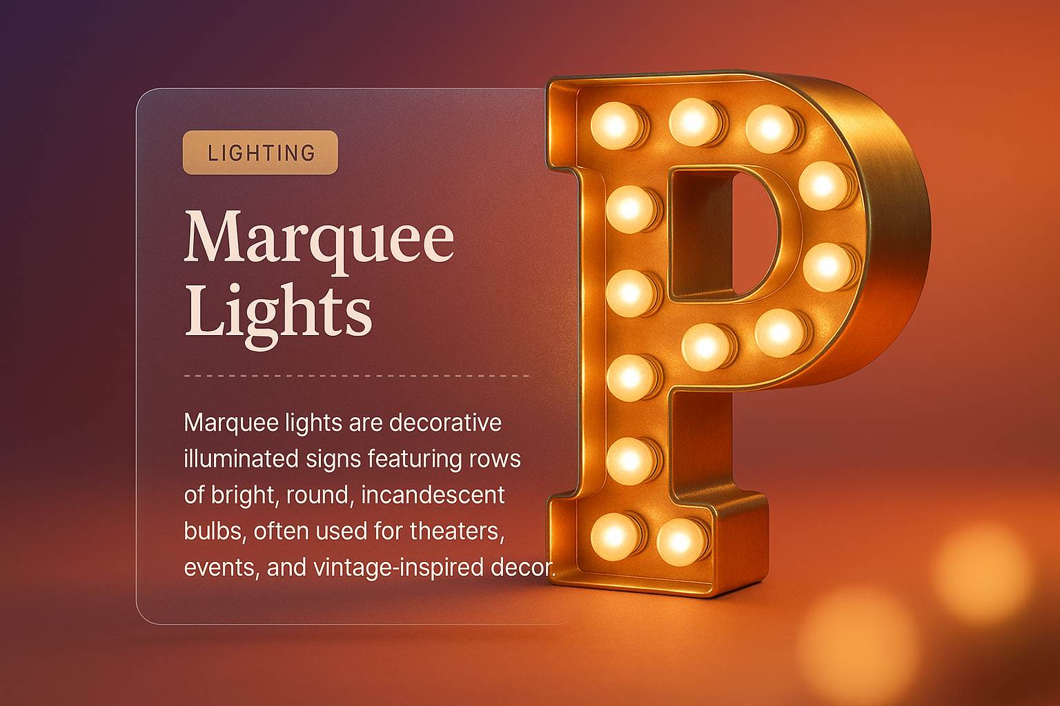 /Collection: /by davooda/Type: PNG/A 3D illustration of a marquee light letter 'P' surrounded by glowing bulbs. It features a transparent text block with a description of marquee lights, set against a smooth gradient background.