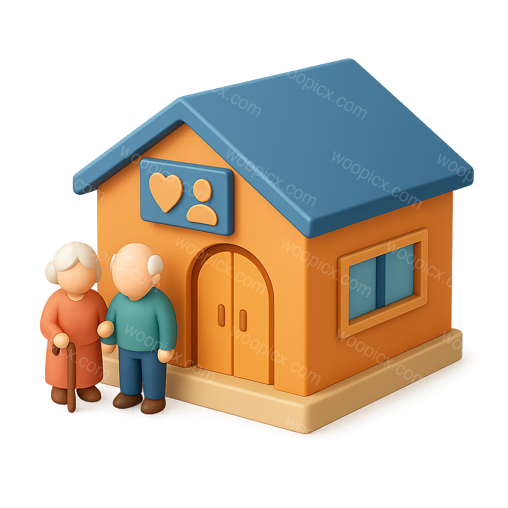 A stylized 3D icon depicting an adult daycare center, featuring a small house with a blue roof and two elderly figures, symbolizing care and companionship.