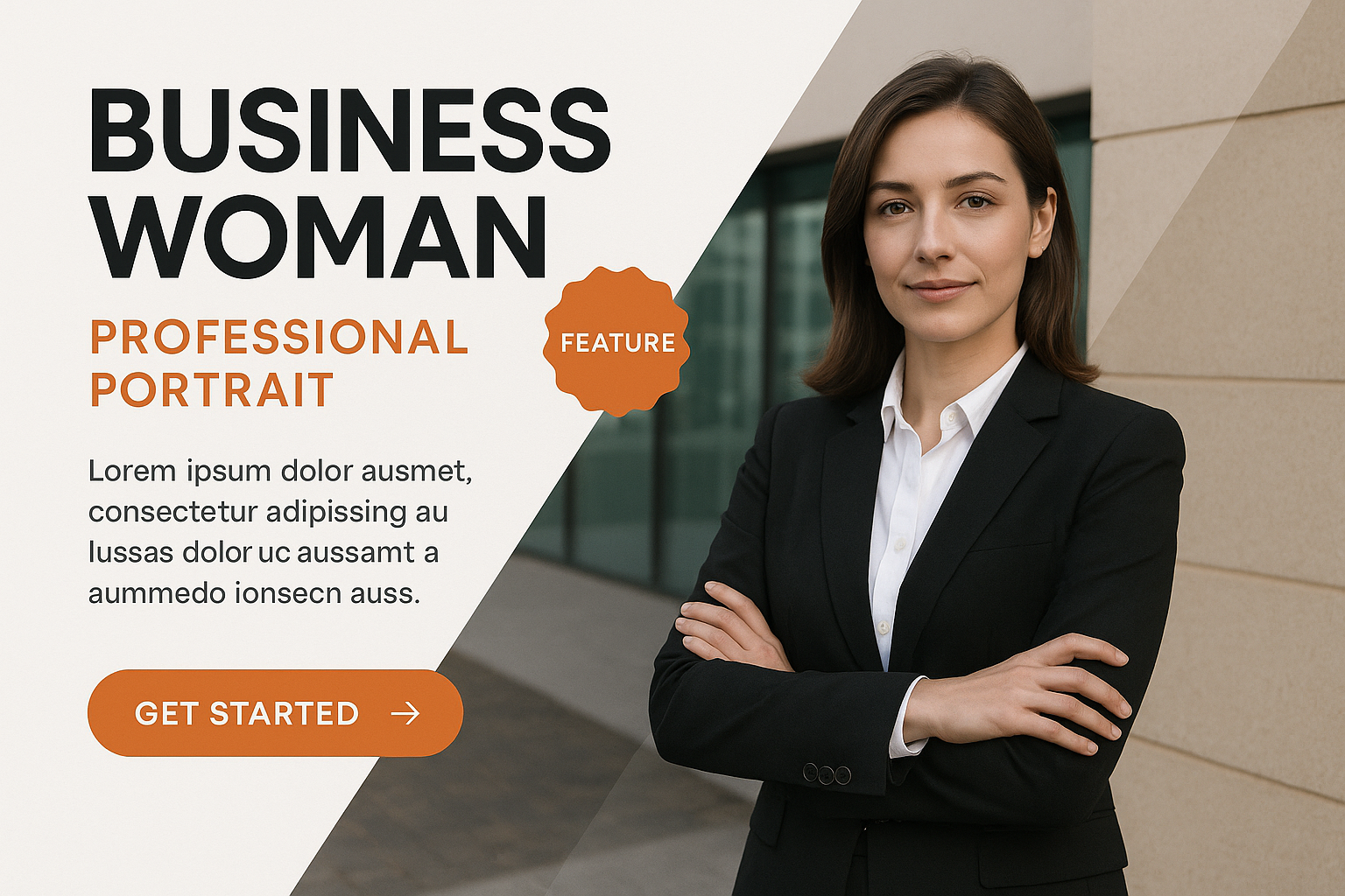 /Collection: /by davooda/Type: PNG/A realistic portrait of a confident businesswoman in a suit, arms crossed, set against a modern office background. The design includes engaging typography and a call-to-action button.