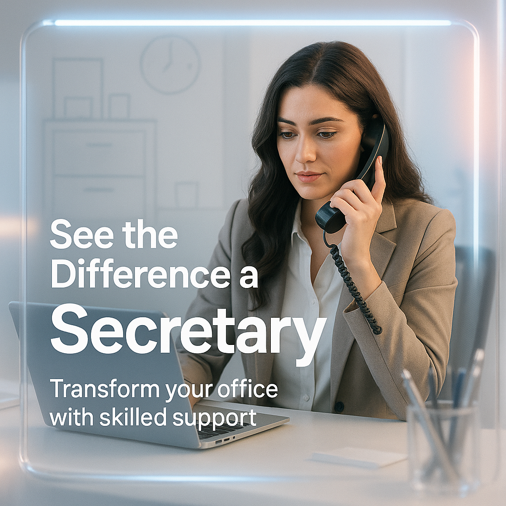 A modern promotional image showcasing a professional woman in an office setting, highlighting the benefits of secretary support. Ideal for marketing materials targeting businesses.