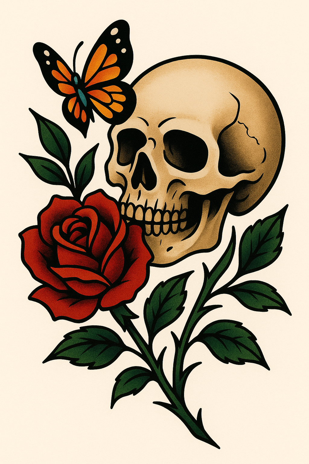 Stylized tattoo art showcasing a skull, a vibrant red rose, and a butterfly, blending themes of life and death. Ideal for tattoo enthusiasts and artists.