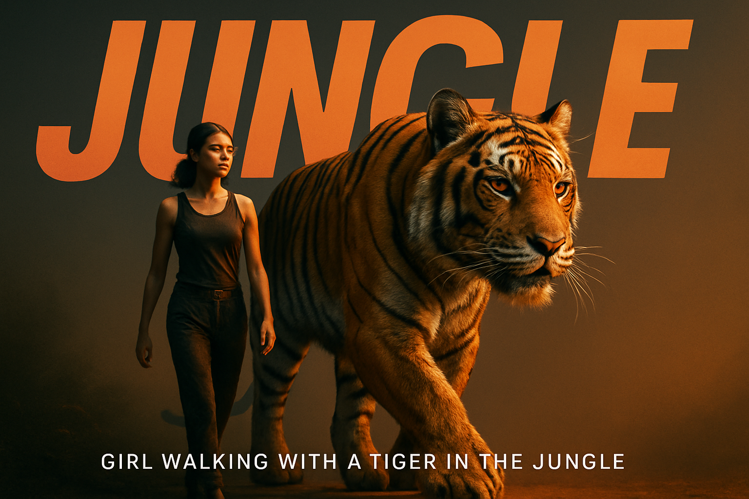 Adventure Scene Featuring a Girl Walking with a Tiger in a Jungle