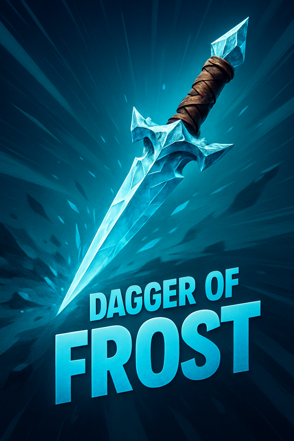 /Collection: /by davooda/Type: PNG/A striking 3D illustration of a frost-themed dagger, featuring a dynamic background with sharp lines radiating outward. The title 'Dagger of Frost' is prominently displayed in bold, engaging typography, enhancing the icy theme.