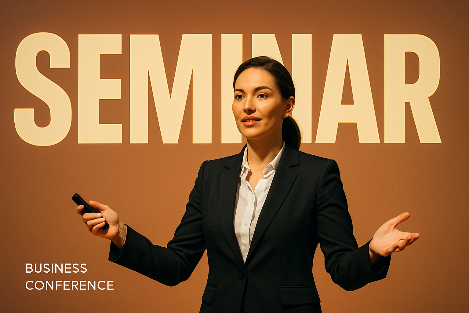 /Collection: /by davooda/Type: PNG/A confident businesswoman delivers a corporate presentation at a seminar, showcasing her expertise. The image features a dramatic background with bold typography and a balanced layout.