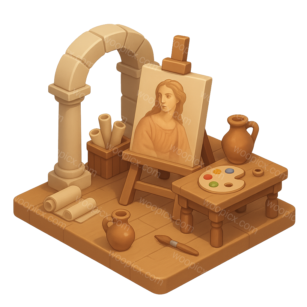 /Premium/Collection: /by davooda/Type: PNG/A 3D isometric representation of a renaissance art studio, featuring an easel with a painting, pottery, and art supplies, all set against a soft gradient background.