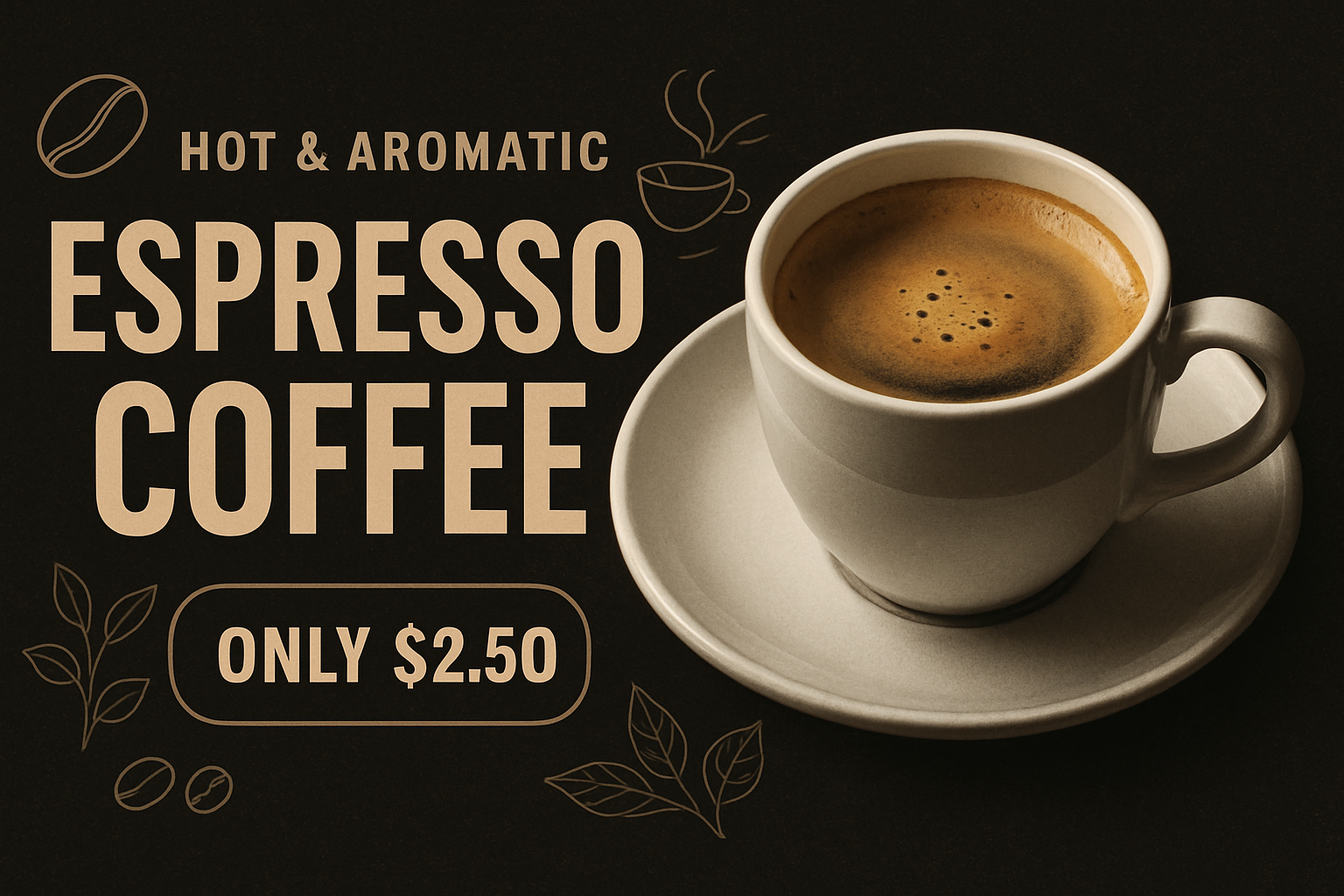 /Collection: /by davooda/Type: PNG/This vibrant advertisement showcases a hot cup of aromatic espresso coffee on a textured dark background. It features bold typography, emphasizing the product and price in a modern layout.