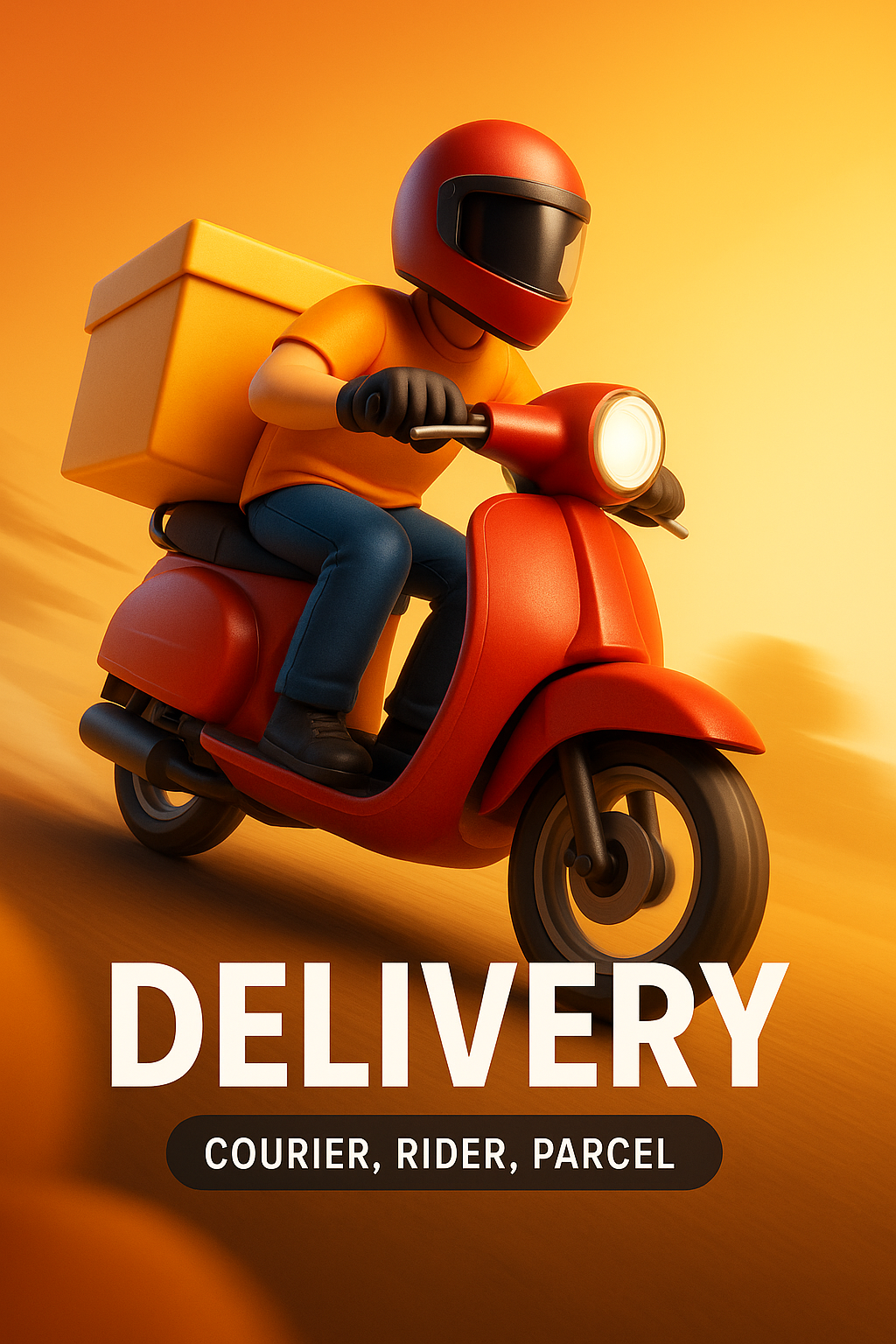 This image features a 3D illustration of a delivery rider on a scooter, ideal for logistics or delivery service promotions. It uses vibrant colors and a dynamic pose.
