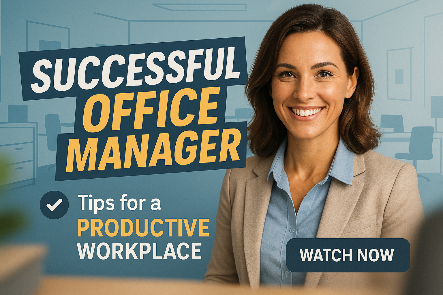 Engaging promotional graphic featuring a smiling woman in a professional setting, designed to highlight tips for effective office management and productivity. Ideal for social media or video content.