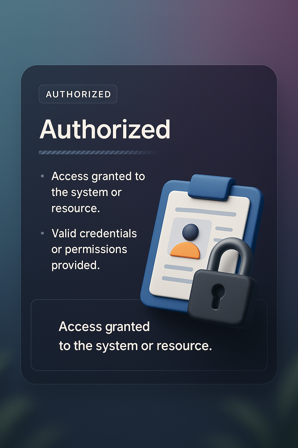 /Collection: /by davooda/Type: PNG/A 3D illustration showcasing a web block titled 'Authorized', featuring a clipboard, lock icon, and text elements. The design emphasizes security and access permissions.