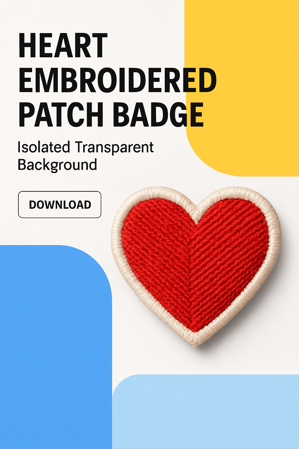 /Collection: /by davooda/Type: PNG/This image showcases a heart embroidered patch badge against a bright geometric background, featuring clear typography and a call-to-action button, emphasizing modern design.