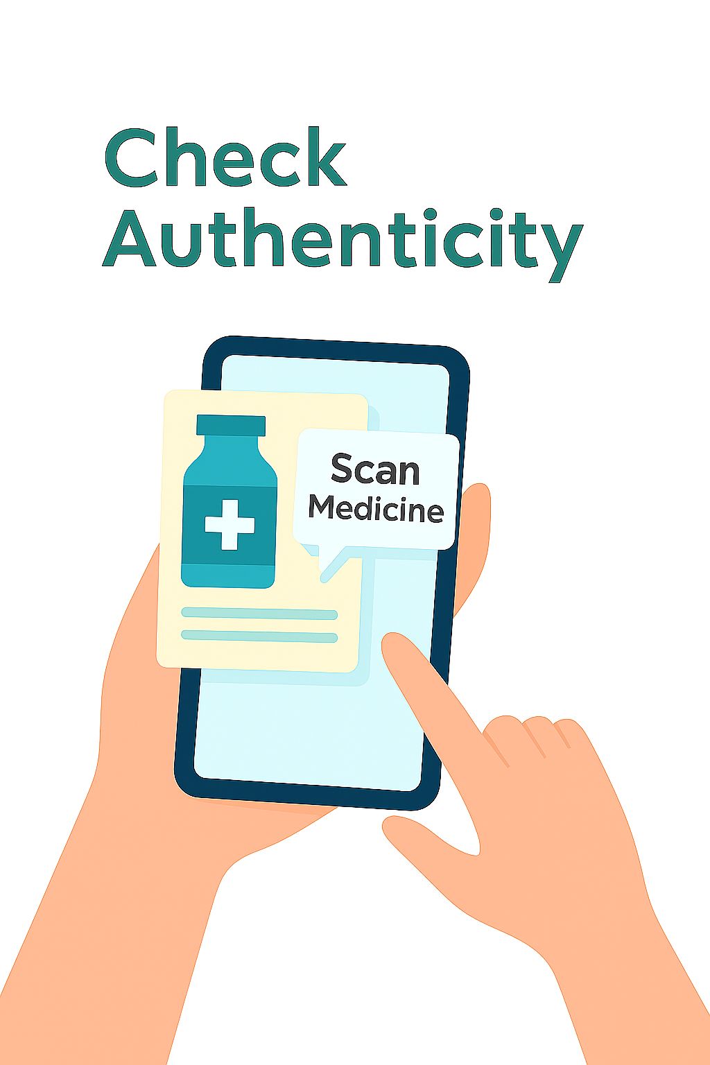 Illustrative graphic depicting a mobile app interface for verifying medicine authenticity through scanning, designed for healthcare and pharmaceutical audiences.