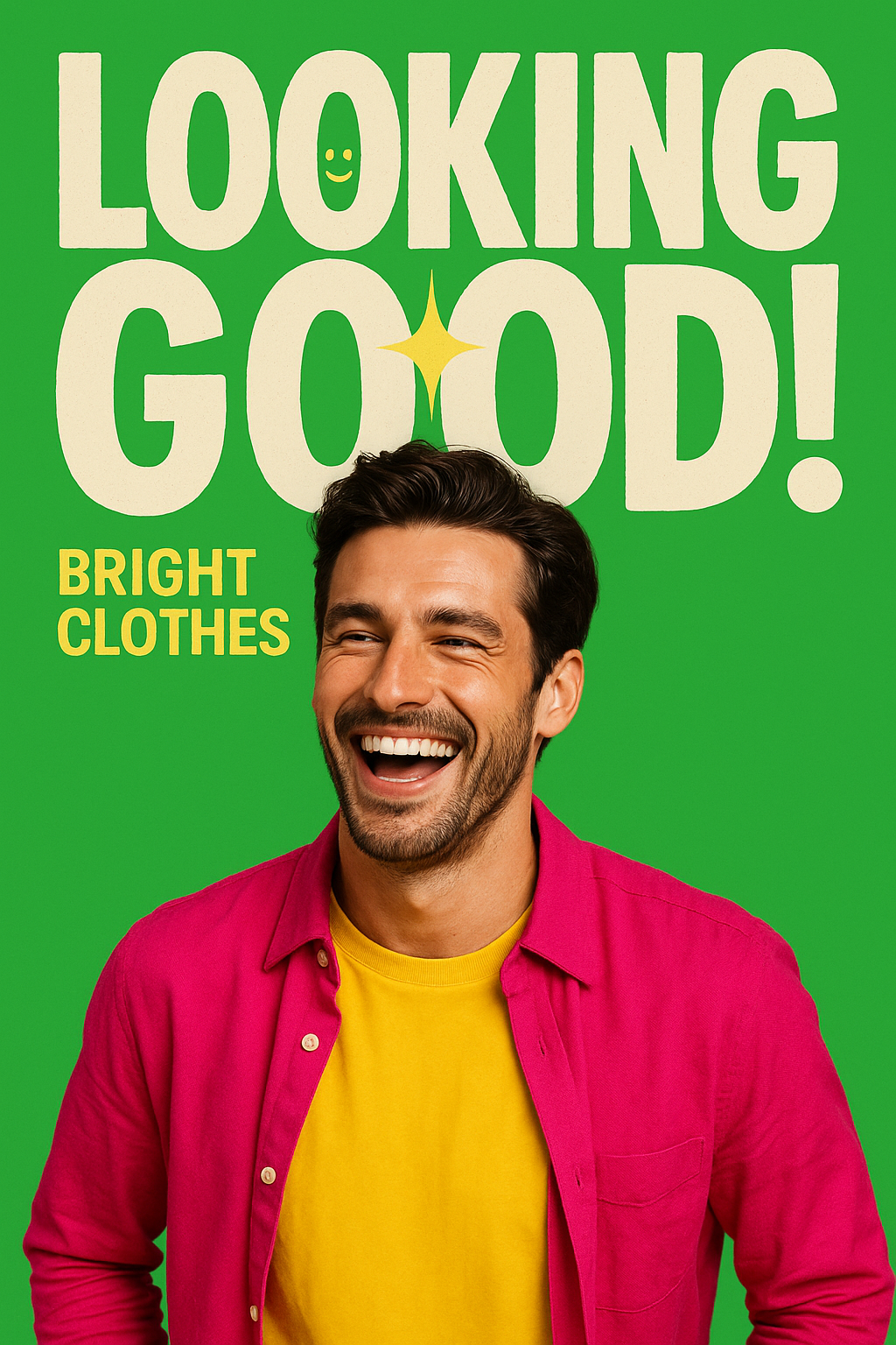 /Collection: /by davooda/Type: PNG/A colorful fashion promotional image showcasing a smiling male model wearing bright clothes. The bold typography and vivid colors create an energetic vibe suitable for marketing campaigns.
