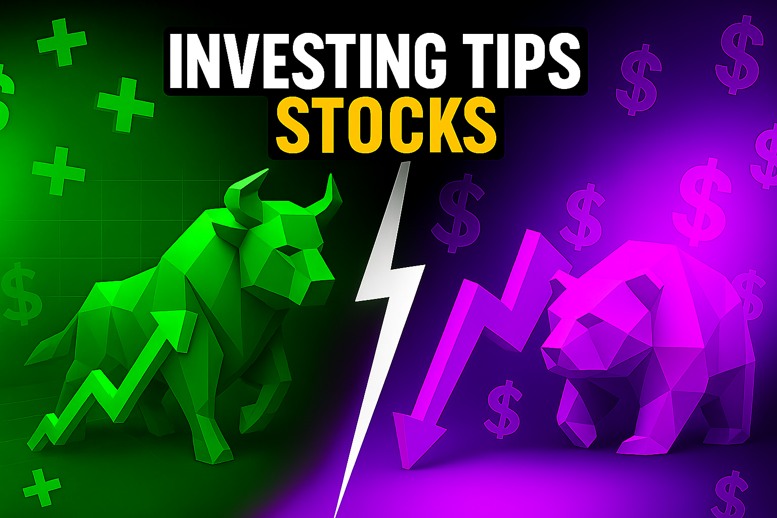 Vibrant graphic illustrating investing tips with a bull and bear representing stock market trends, ideal for financial education content.