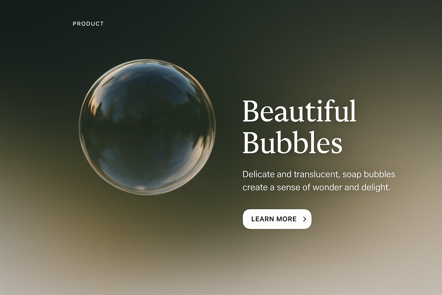 A clean and modern web design showcasing a translucent bubble with a gradient background. The layout includes a product label, a captivating headline, descriptive text, and a call-to-action button.