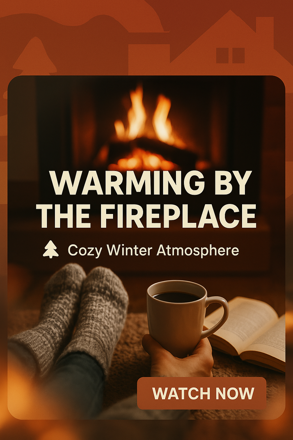 Inviting promotional graphic featuring a warm fireplace scene, ideal for winter-themed content. The cozy design evokes feelings of comfort and relaxation.