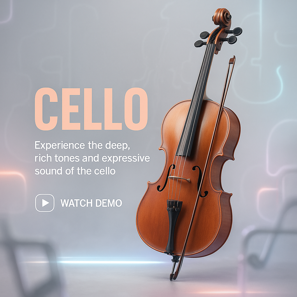 3D rendered image of a cello with a soft gradient background, designed to promote a demo video. Ideal for music education and instrument promotion.