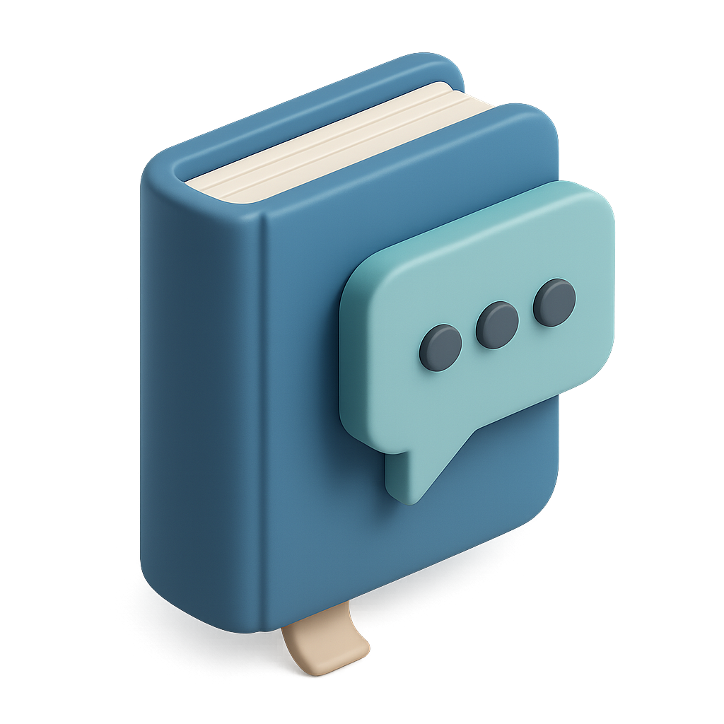 /Collection: /by davooda/Type: PNG/A creative 3D icon depicting a book with a speech bubble, symbolizing natural language processing. The design features a blue color scheme and a three-quarter view, enhancing its isometric and volumetric appearance.