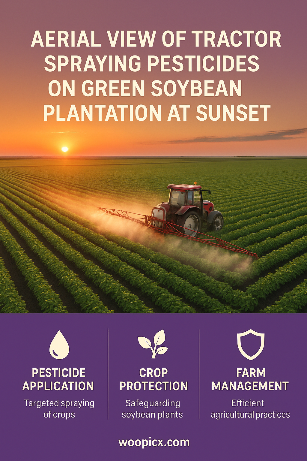 /Collection: /by davooda/Type: PNG/Aerial agricultural image showcasing a tractor applying pesticides on a vibrant green soybean plantation during sunset. Ideal for agricultural marketing and education.