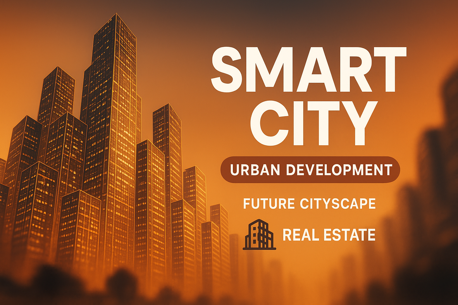 A visually striking illustration depicting a futuristic smart city skyline, ideal for urban development and real estate marketing. The warm color palette evokes a sense of innovation.