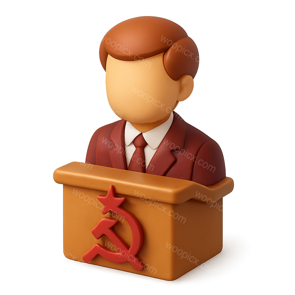 A 3D icon representing a politburo figure with a stylized bust and a box featuring the communist emblem. The design has a transparent background and a volumetric, isometric look.
