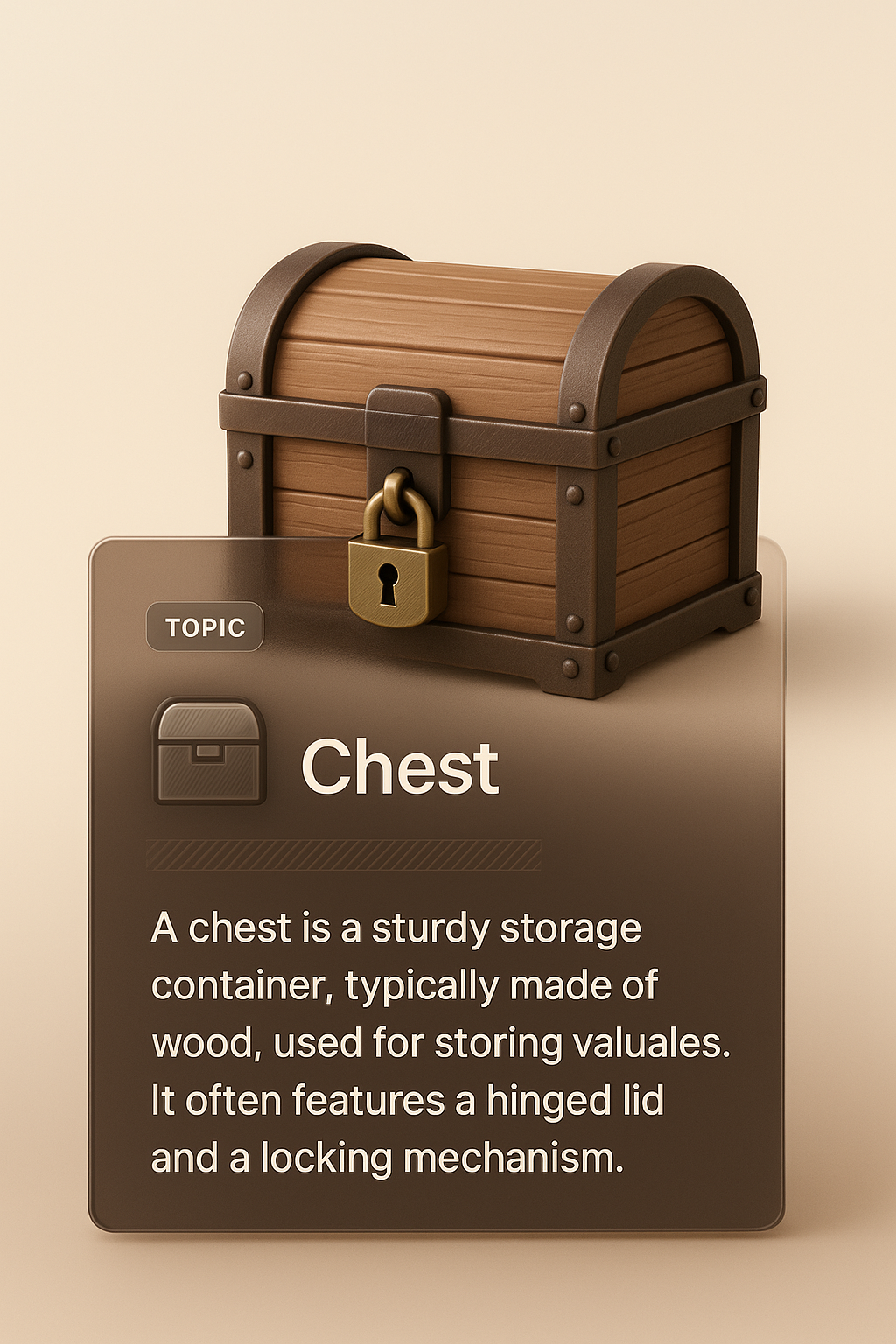 A well-crafted 3D illustration of a wooden chest with a hinged lid, complemented by a transparent overlay that contains descriptive text about the chest.