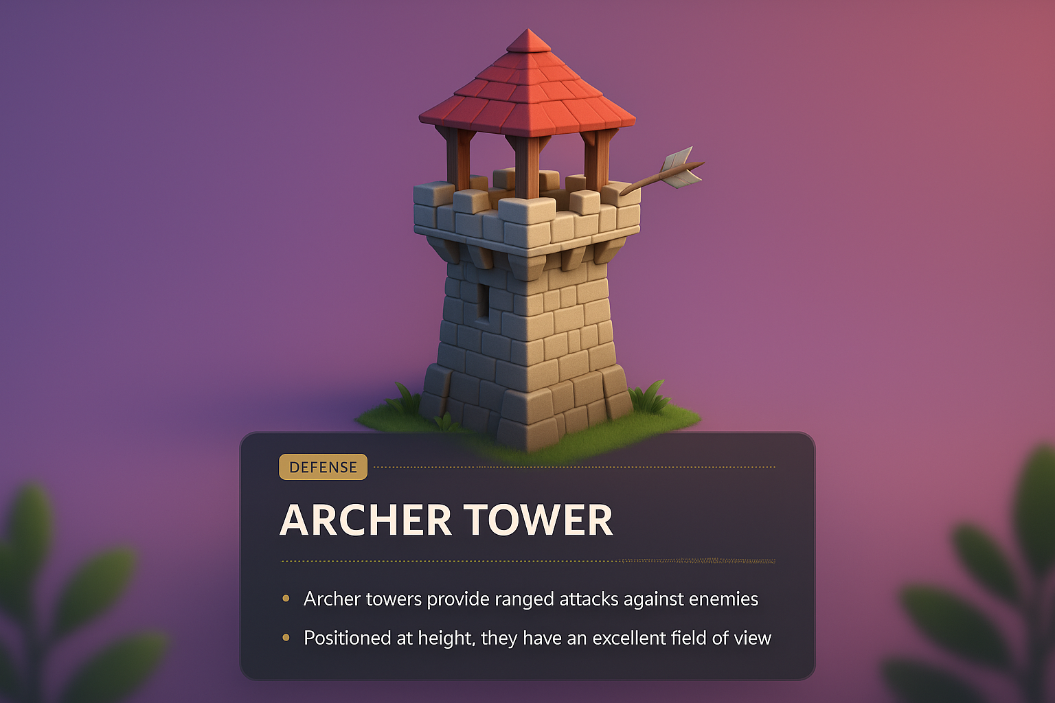 /Collection: /by davooda/Type: PNG/A vibrant 3D illustration of an archer tower featuring a detailed design and a dark overlay with informative text about its defensive capabilities. The scene includes a smooth gradient background.