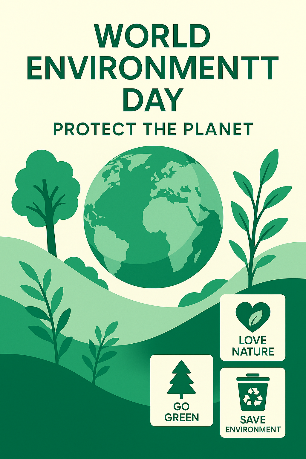 Vibrant promotional graphic for World Environment Day, featuring green-themed design elements like trees and the Earth, aimed at raising environmental awareness.