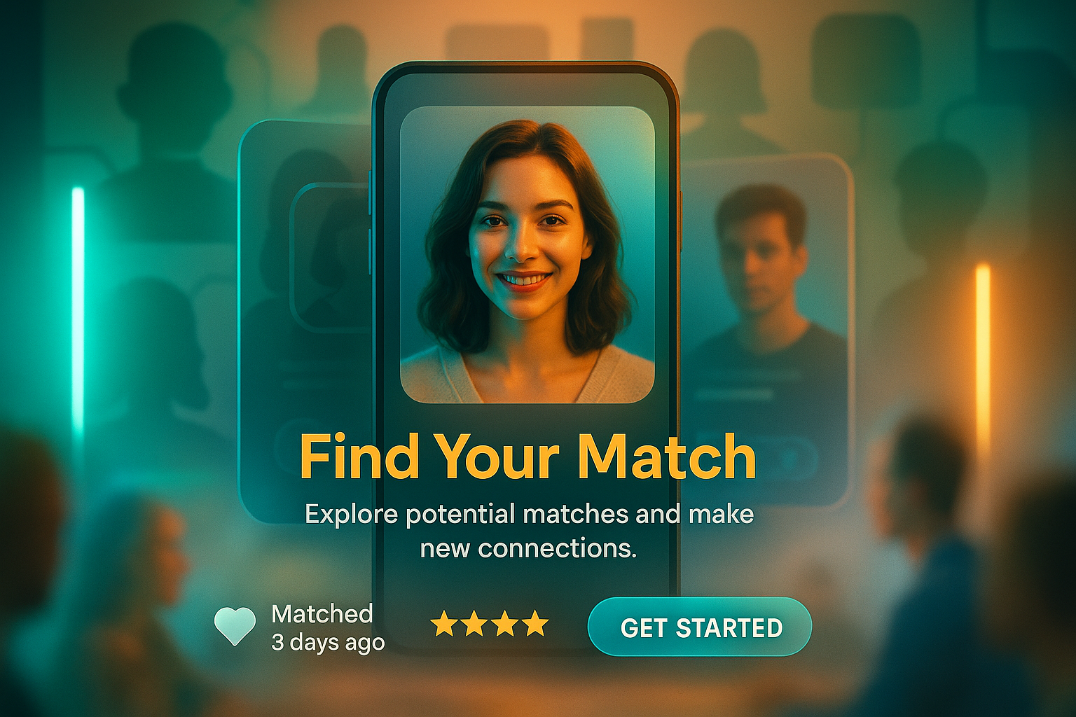 /Collection: /by davooda/Type: PNG/Modern promotional graphic for a dating app featuring a user interface design. The image highlights user engagement with vibrant colors and an inviting layout, aimed at attracting new users.