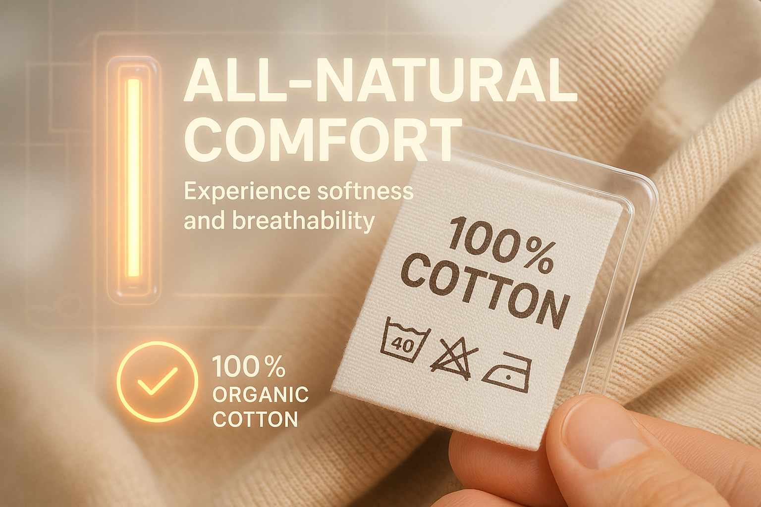 A product tag design highlighting the benefits of organic cotton, featuring a soft fabric background and modern typography. Ideal for eco-friendly apparel marketing.
