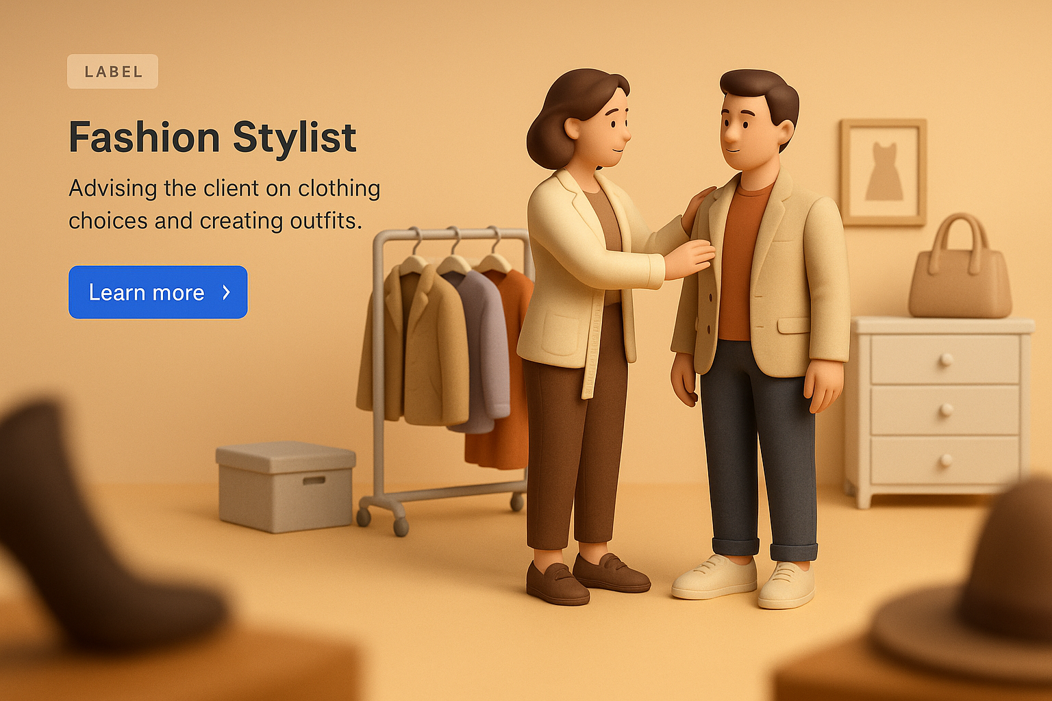 /Collection: /by davooda/Type: PNG/A detailed 3D illustration showcasing a fashion stylist advising a client on outfit choices. The scene includes a clothing rack and a soft, gradient background, enhancing visual appeal.