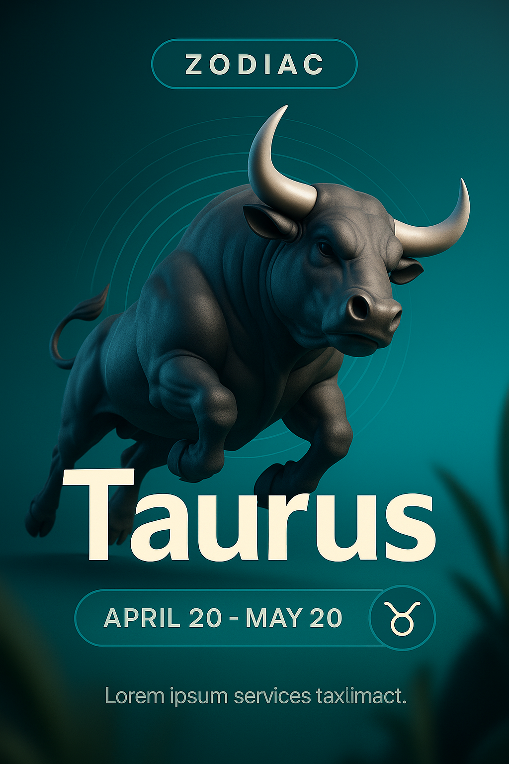 A dynamic 3D illustration of the Taurus zodiac sign, featuring a powerful bull in motion. The design includes a smooth gradient background and bold typography.