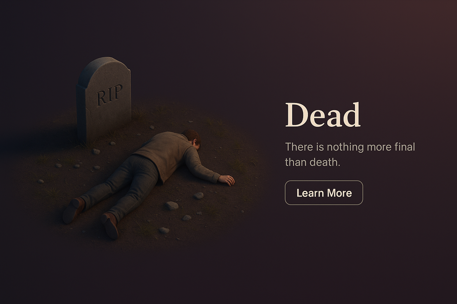 A high perspective 3D scene depicting a man lying near a grave with the word 'RIP' inscribed. The dark background contrasts with the foreground elements featuring the text block and action button.