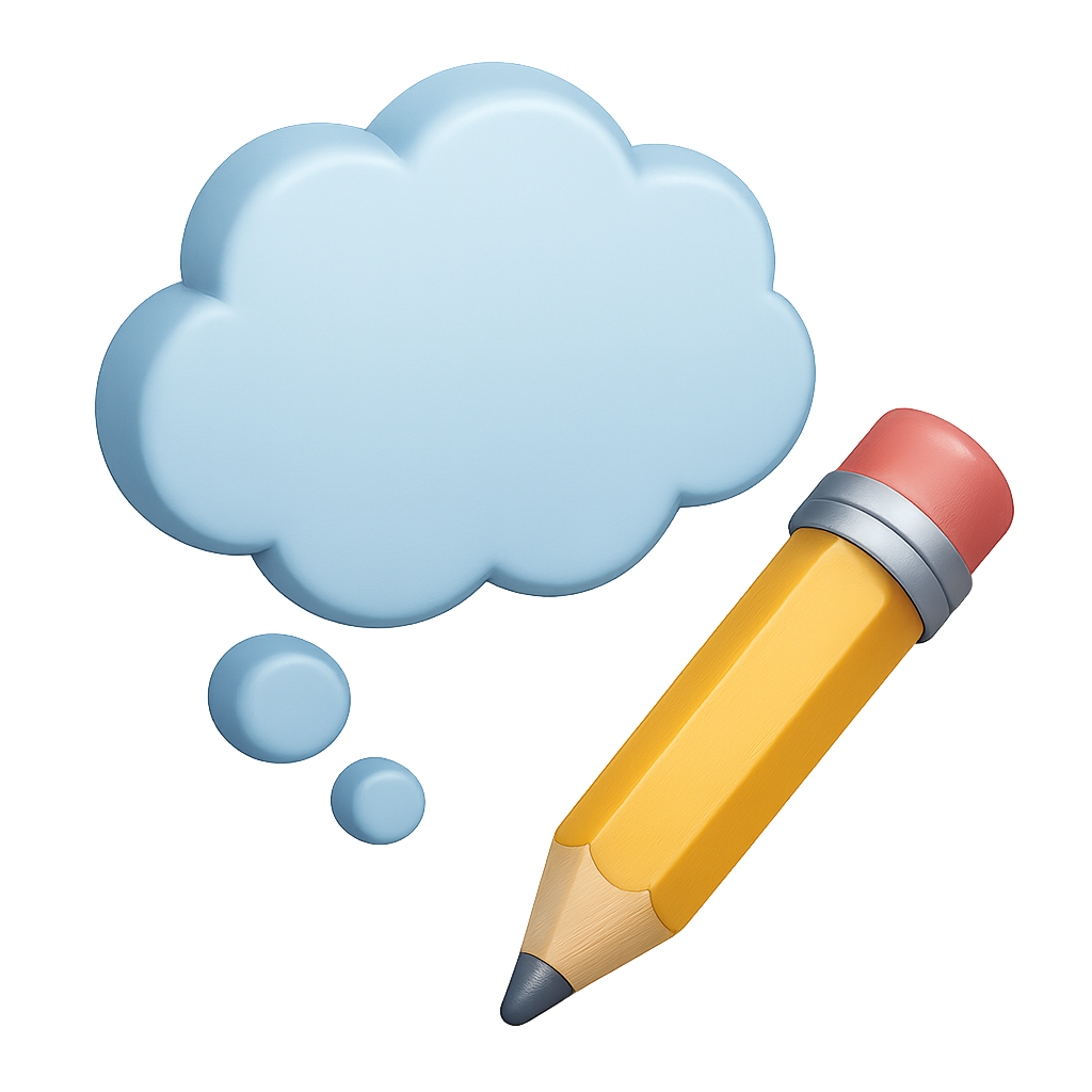 /Collection: /by davooda/Type: PNG/A 3D representation of a thought bubble alongside a pencil, designed in a three-quarter isometric view with a transparent background, emphasizing volumetric details.