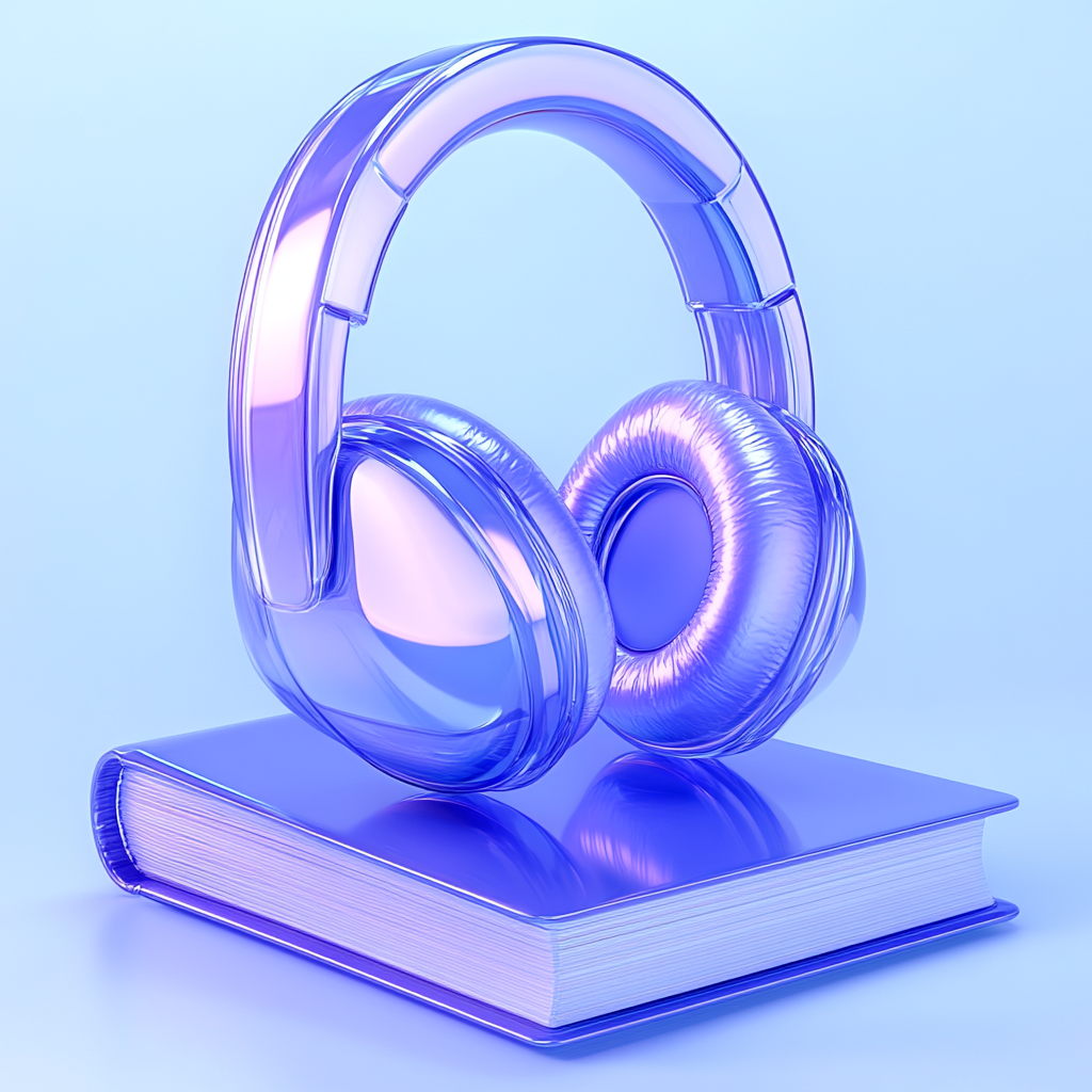 A visually appealing 3D render featuring translucent headphones resting on a book, designed in soft blue tones. Ideal for music or education-related content.