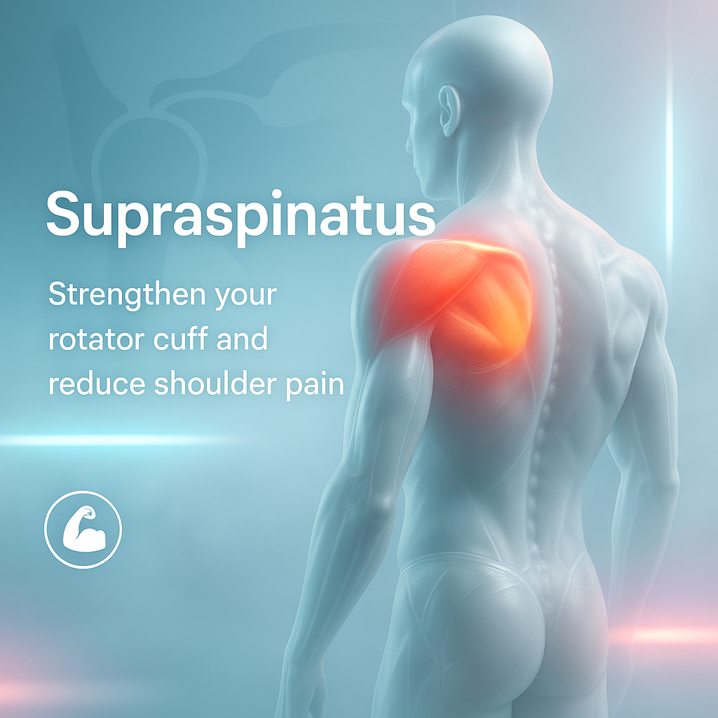 /Collection: /by davooda/Type: PNG/A 3D illustration depicting the supraspinatus muscle, designed for educational purposes. The graphic uses a cool color palette with a focus on anatomy and fitness, ideal for health and wellness marketing.