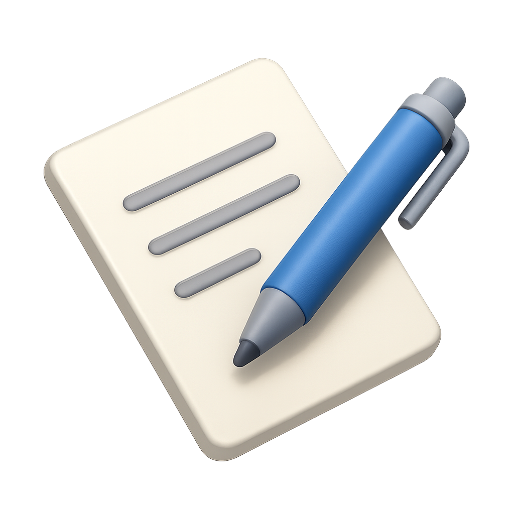 /Collection: /by davooda/Type: PNG/A visually appealing 3D illustration of a document and pen, showcasing a sleek design with a three-quarter view, emphasizing depth and volume with a transparent background.
