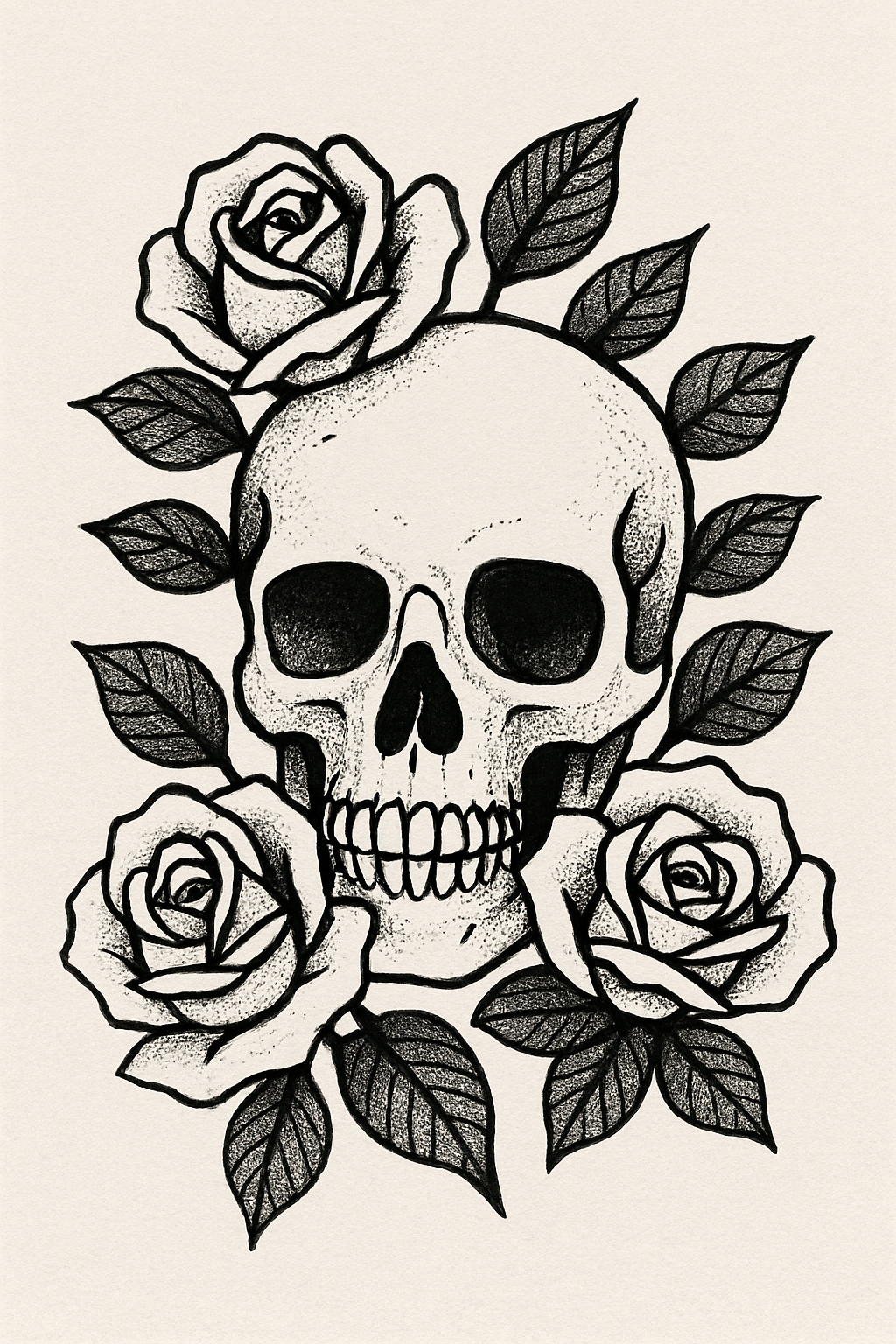 /Collection: /by davooda/Type: PNG/This image features a detailed illustration of a skull surrounded by roses and leaves, showcasing a bold, tattoo-inspired design. Ideal for art, tattoo culture, and graphic design.