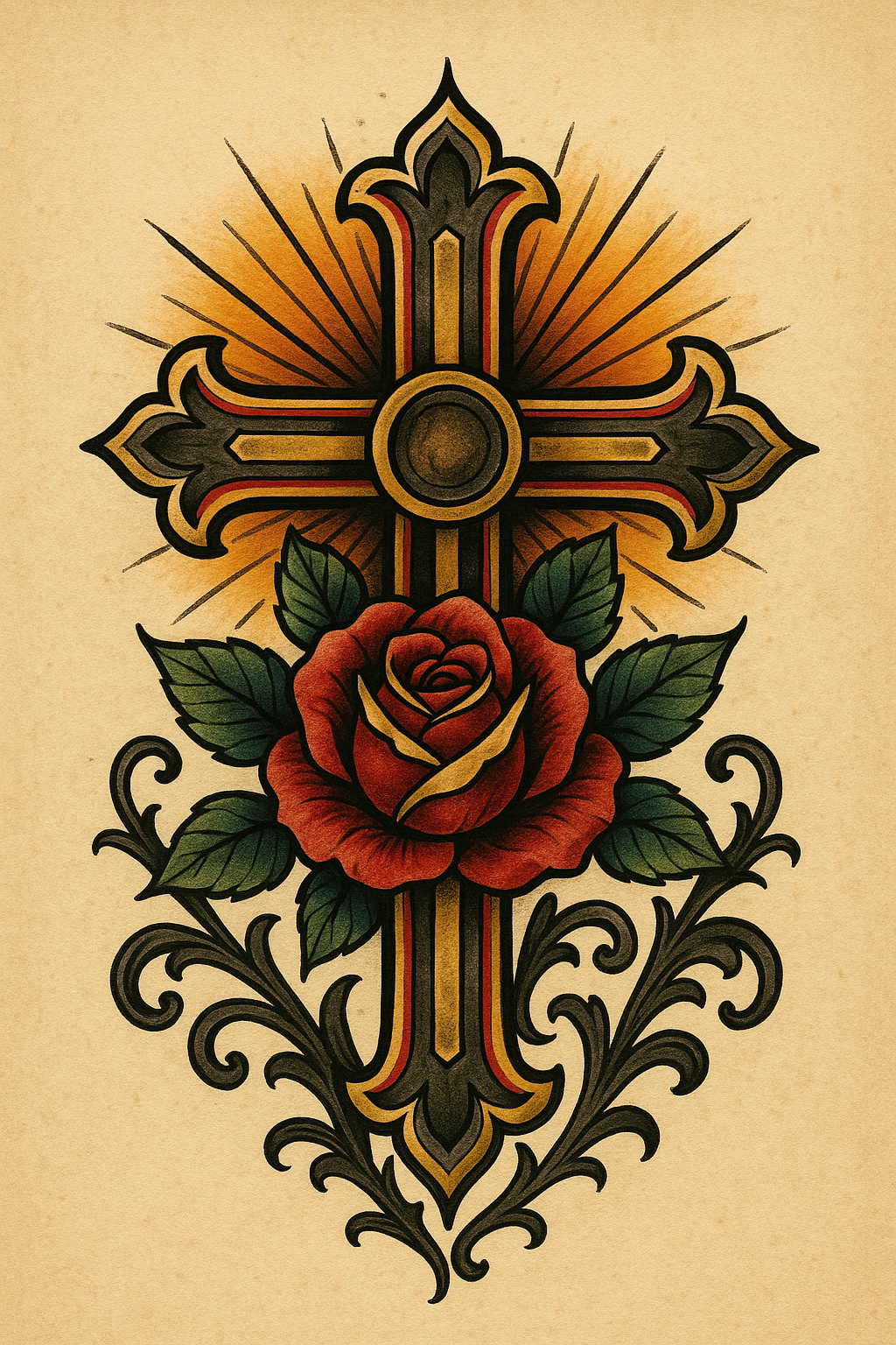 This image features a traditional tattoo design showcasing a cross and a red rose with ornate detailing, suitable for tattoo art or decorative prints.