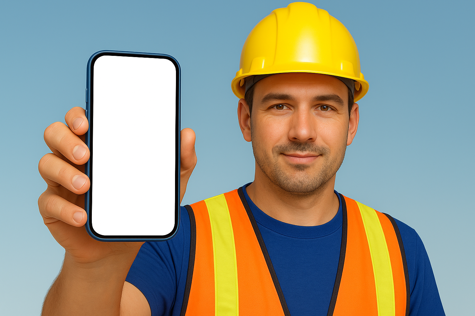 /Collection: /by davooda/Type: PNG/A male construction worker wearing a yellow hard hat and reflective vest smiles as he holds a blue smartphone with a blank screen, set against a clear blue sky.