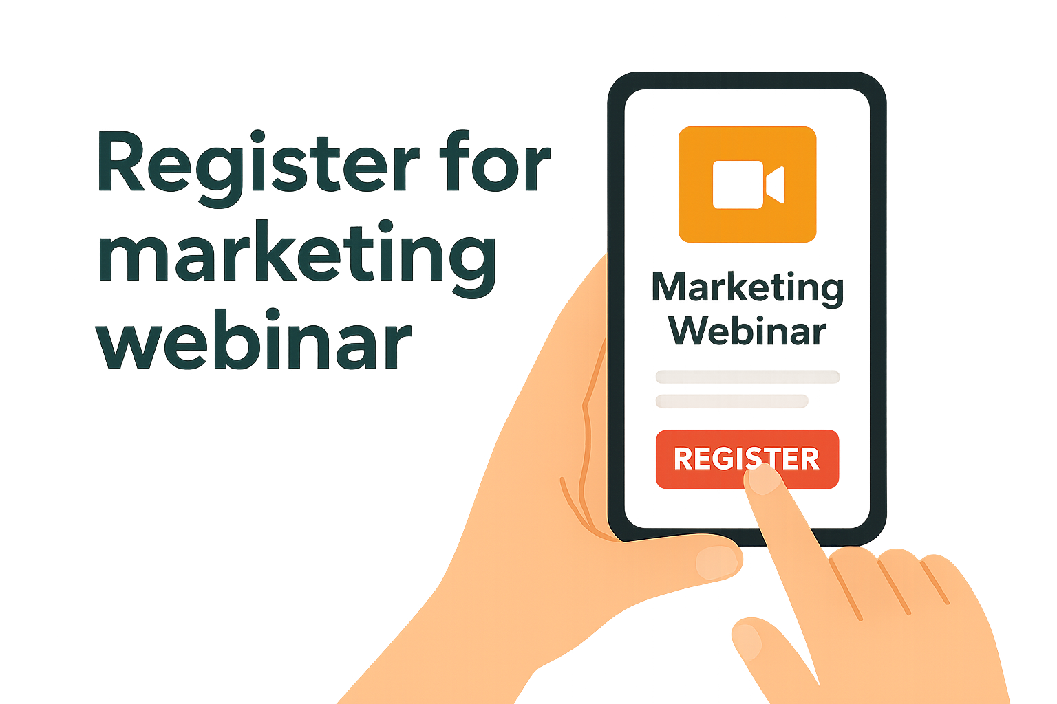 /Collection: /by davooda/Type: PNG/Digital illustration promoting a marketing webinar registration, featuring a hand holding a smartphone with a 'Register' button. Ideal for digital marketing campaigns.