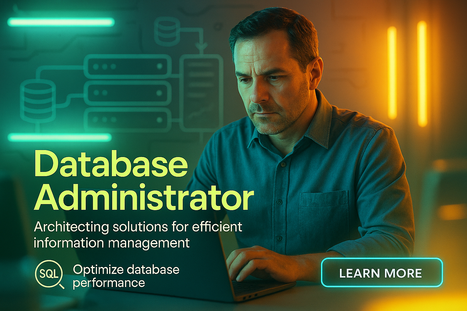 /Collection: /by davooda/Type: PNG/Engaging promotional graphic showcasing a database administrator at work, featuring modern design elements and vibrant colors, ideal for tech-related marketing.