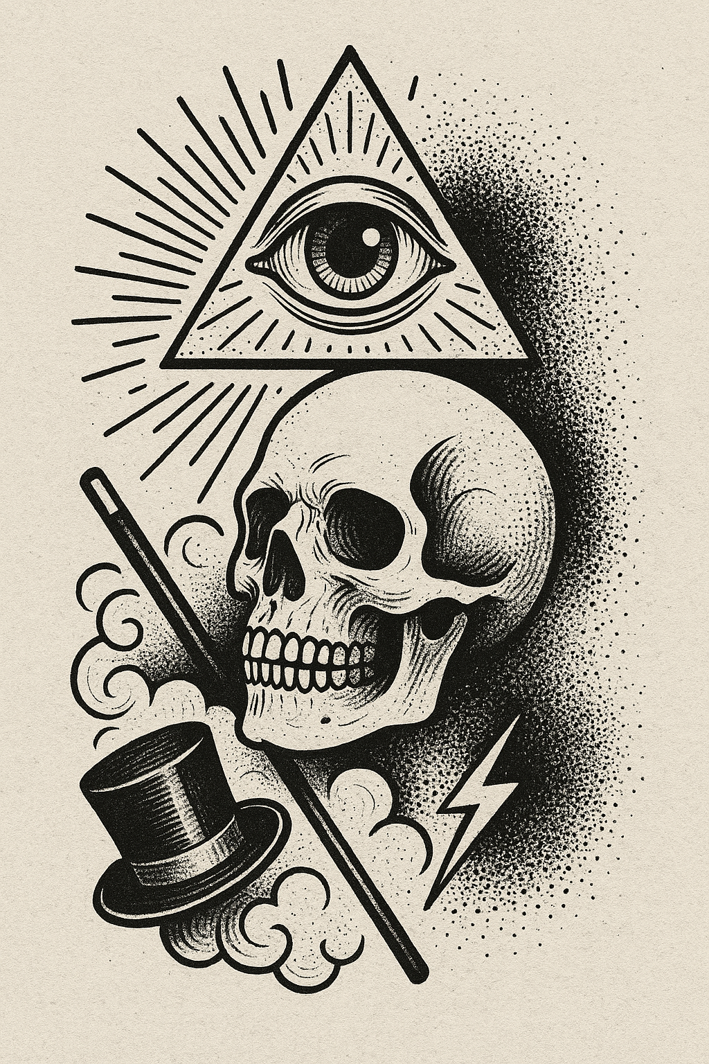 /Collection: /by davooda/Type: PNG/A detailed illustration combining a skull, an eye within a triangle, and mystical elements. This graphic is suitable for tattoos, merchandise, or art prints.