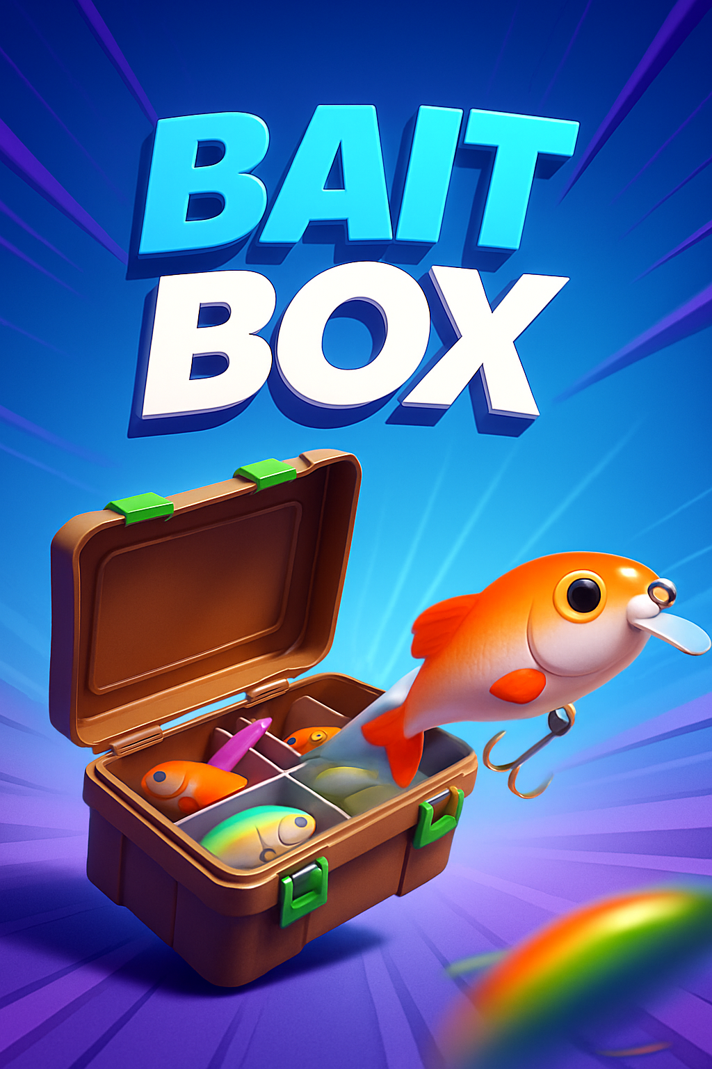 A dynamic 3D illustration of a bait box with colorful fish and fishing gear. The background features a smooth gradient, enhancing the energetic scene.